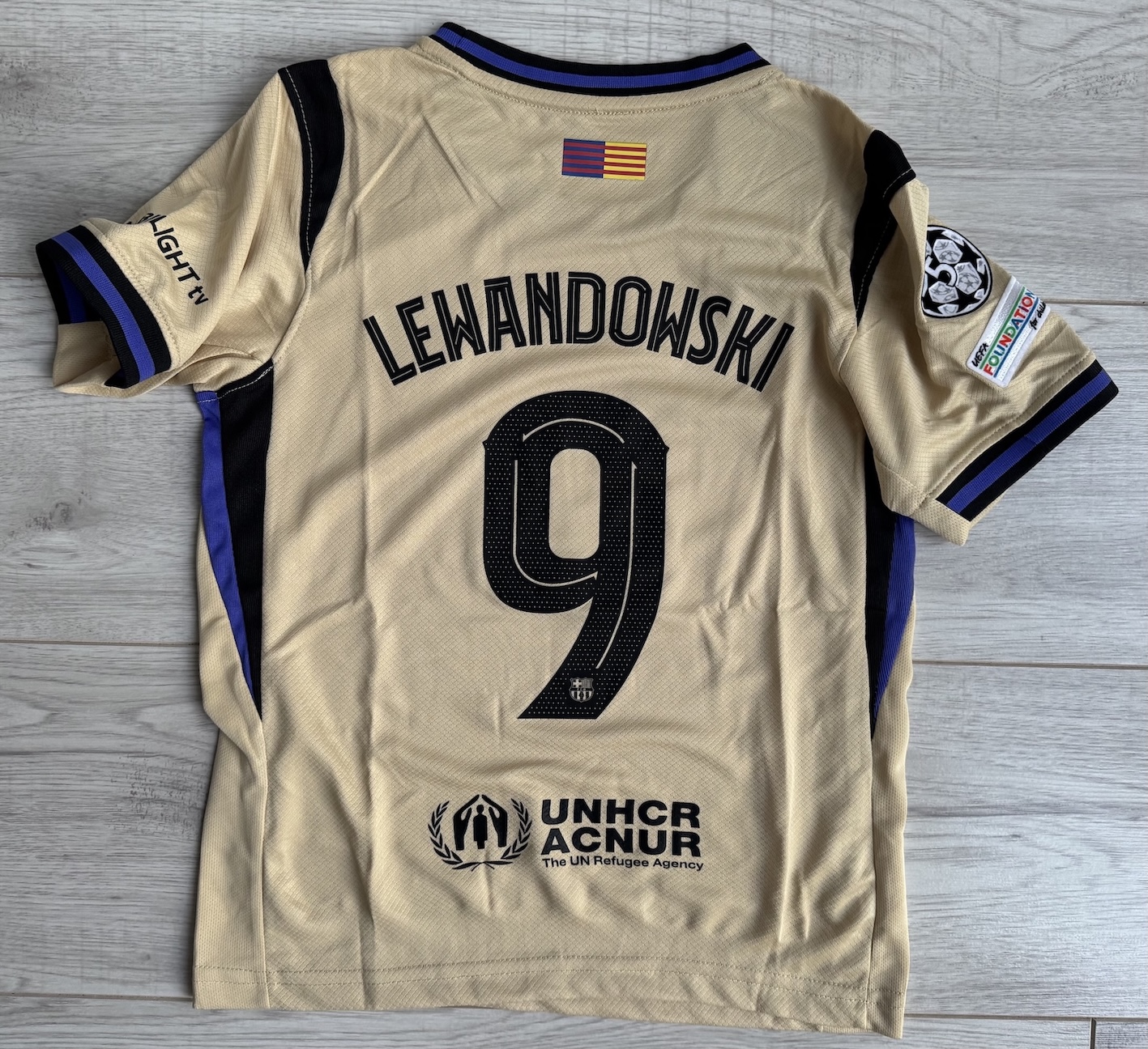 Na plecach widnieje oficjalny nadruk LEWANDOWSKI 9 w złotej perforowanej czcionce pucharowej Barcelony. Na spodenkach umieszczono numer 9 oraz herb klubu.