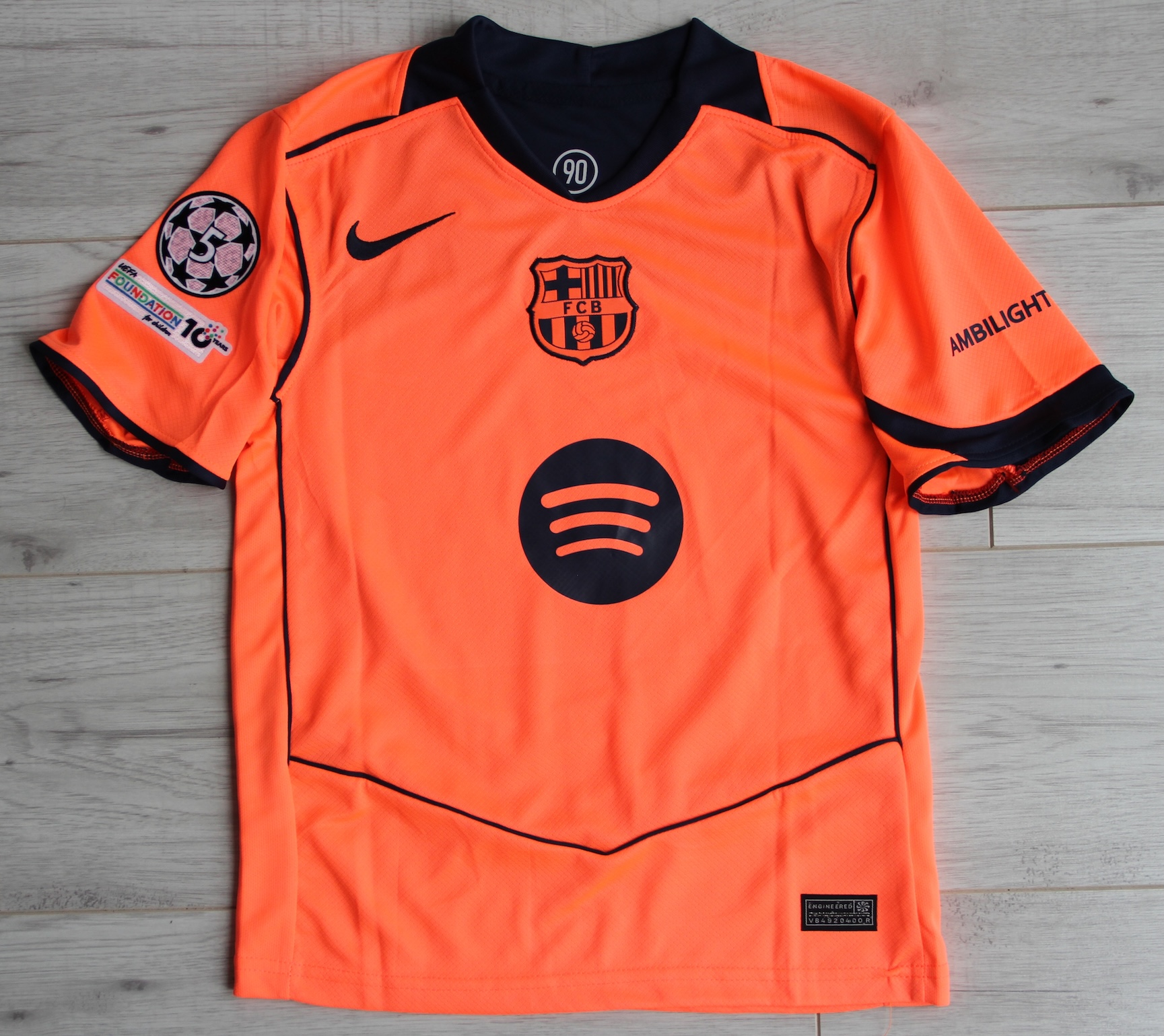 Kompletny zestaw dziecięcy FC Barcelony z sezonu 2025/26 w wersji trzeciej (3rd) 💗💙, wykonany przez firmę Nike. Koszulka w odważnym, różowo-pomarańczowym kolorze z granatowymi akcentami stanowi połączenie nowoczesnego designu i tradycji Blaugrany. Zastosowana technologia Nike Dri-FIT gwarantuje komfort i przewiewność podczas gry. Na przodzie znajduje się herb FC Barcelony, granatowe logo Nike i czarne logo sponsora Spotify. Na rękawie widnieją plakietki Champions League.