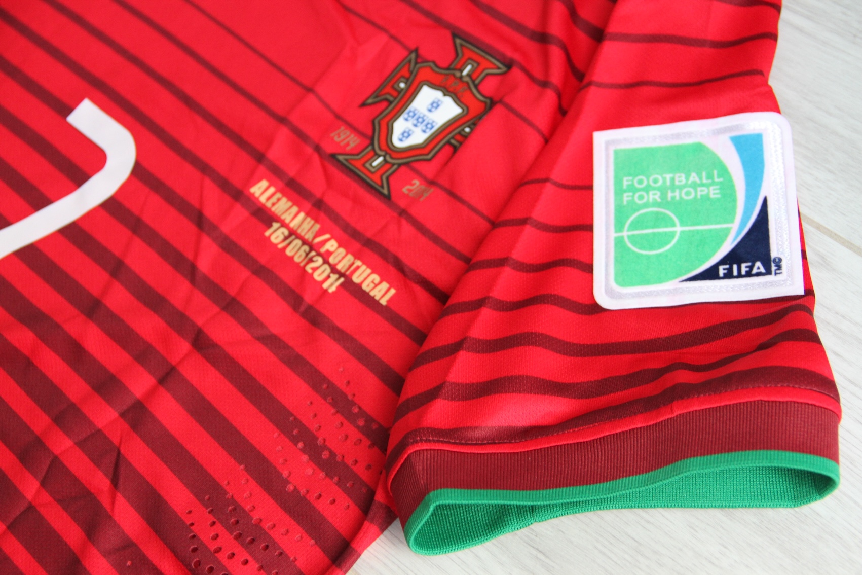 Domowa koszulka reprezentacji Portugalii z Mistrzostw Świata 2014 w Brazylii w wersji meczowej (Match). Klasyczna czerwień z zielonymi detalami oraz dynamiczne poziome pasy tworzą jeden z najbardziej rozpoznawalnych modeli mundialu 2014. Koszulka inspirowana turniejem, w którym występował Cristiano Ronaldo.
