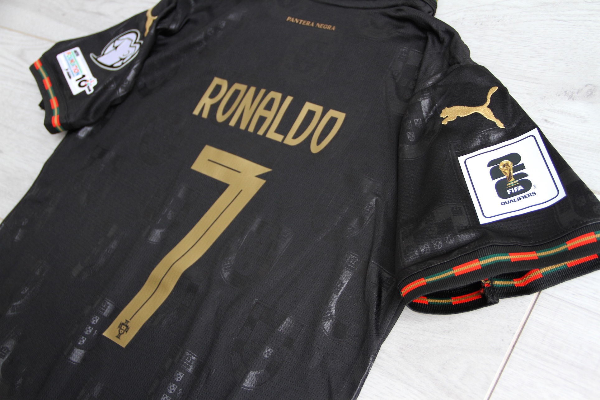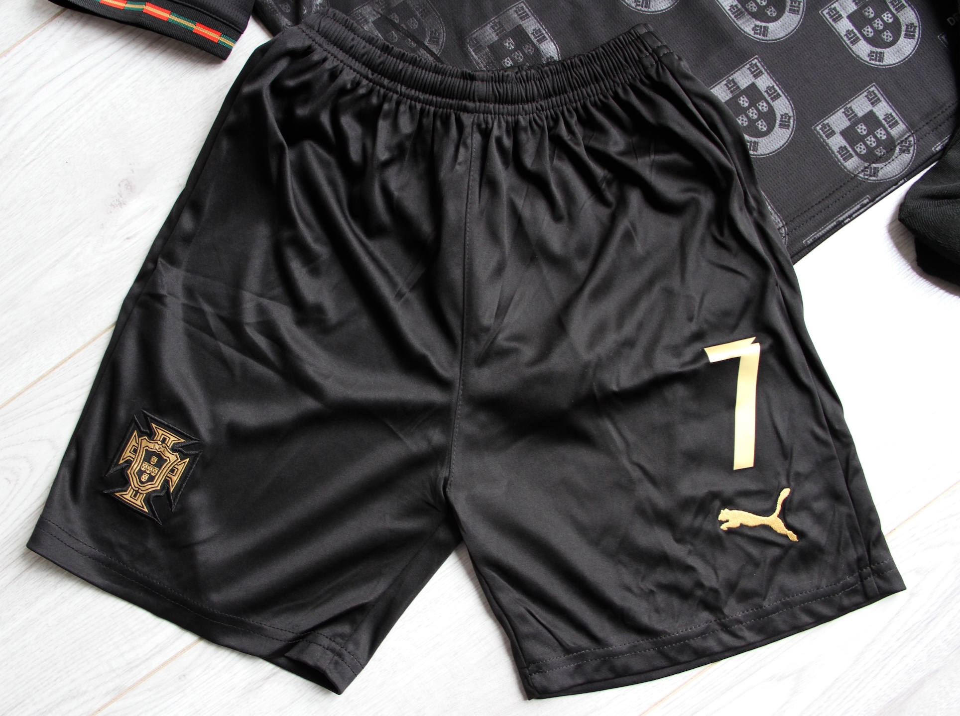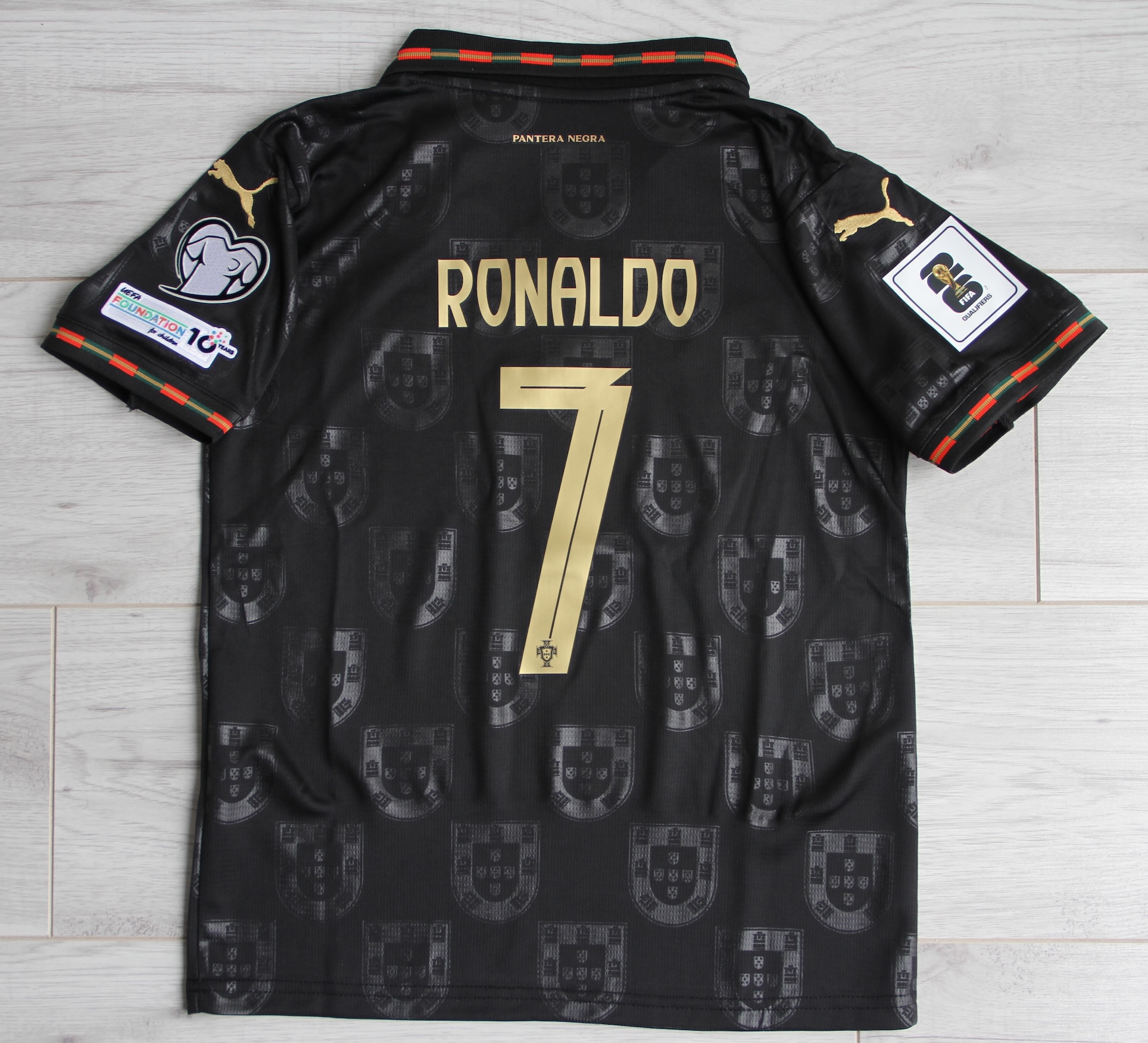 Edycja „Pantera Negra” to hołd dla Eusébio – jednej z największych legend portugalskiego futbolu. Złote detale symbolizują sukcesy reprezentacji, a czarna kolorystyka nadaje zestawowi wyjątkowy, kolekcjonerski charakter. Idealny komplet dla młodego fana Portugalii.