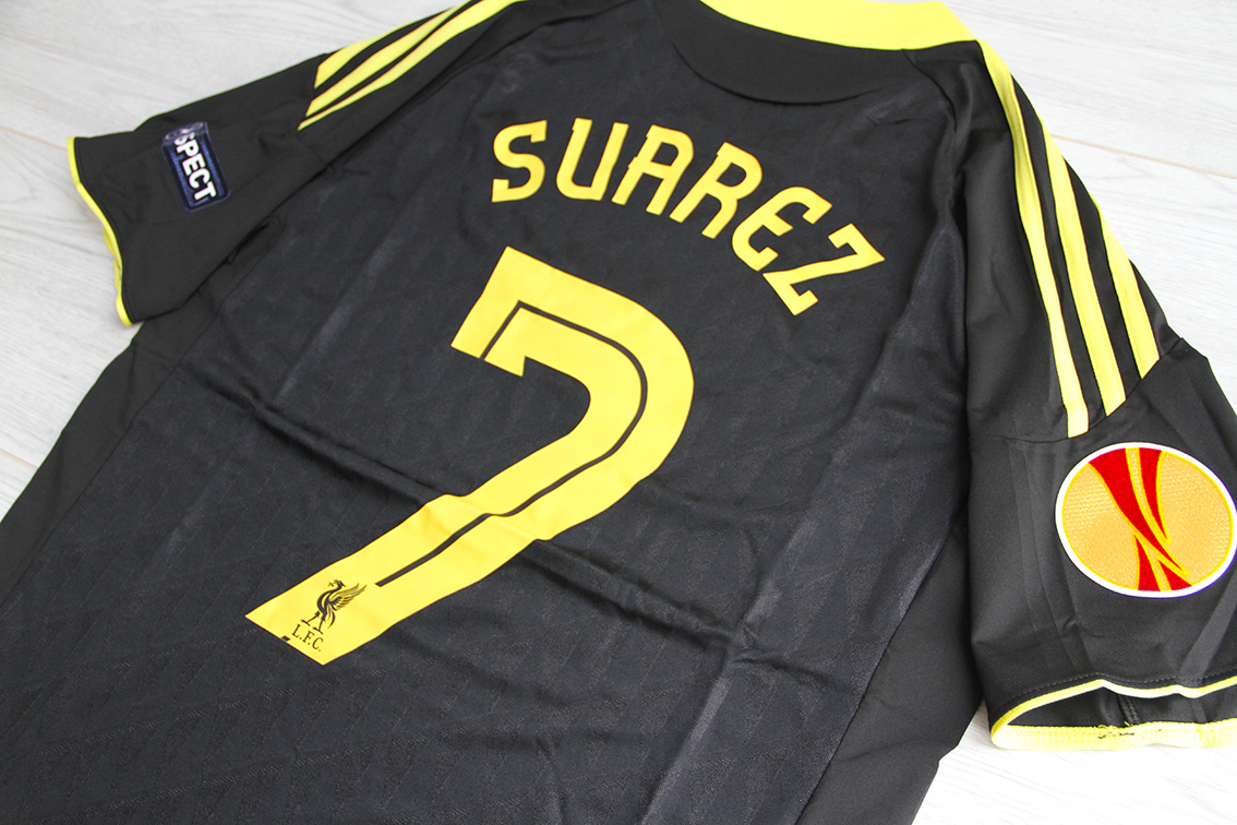Na plecach znajduje się jeden z najbardziej rozpoznawalnych nadruków w historii klubu – SUAREZ 7. Koszulka posiada również oficjalne plakietki rozgrywek europejskich: UEFA Europa League oraz UEFA Respect, co nadaje jej autentycznego meczowego charakteru.